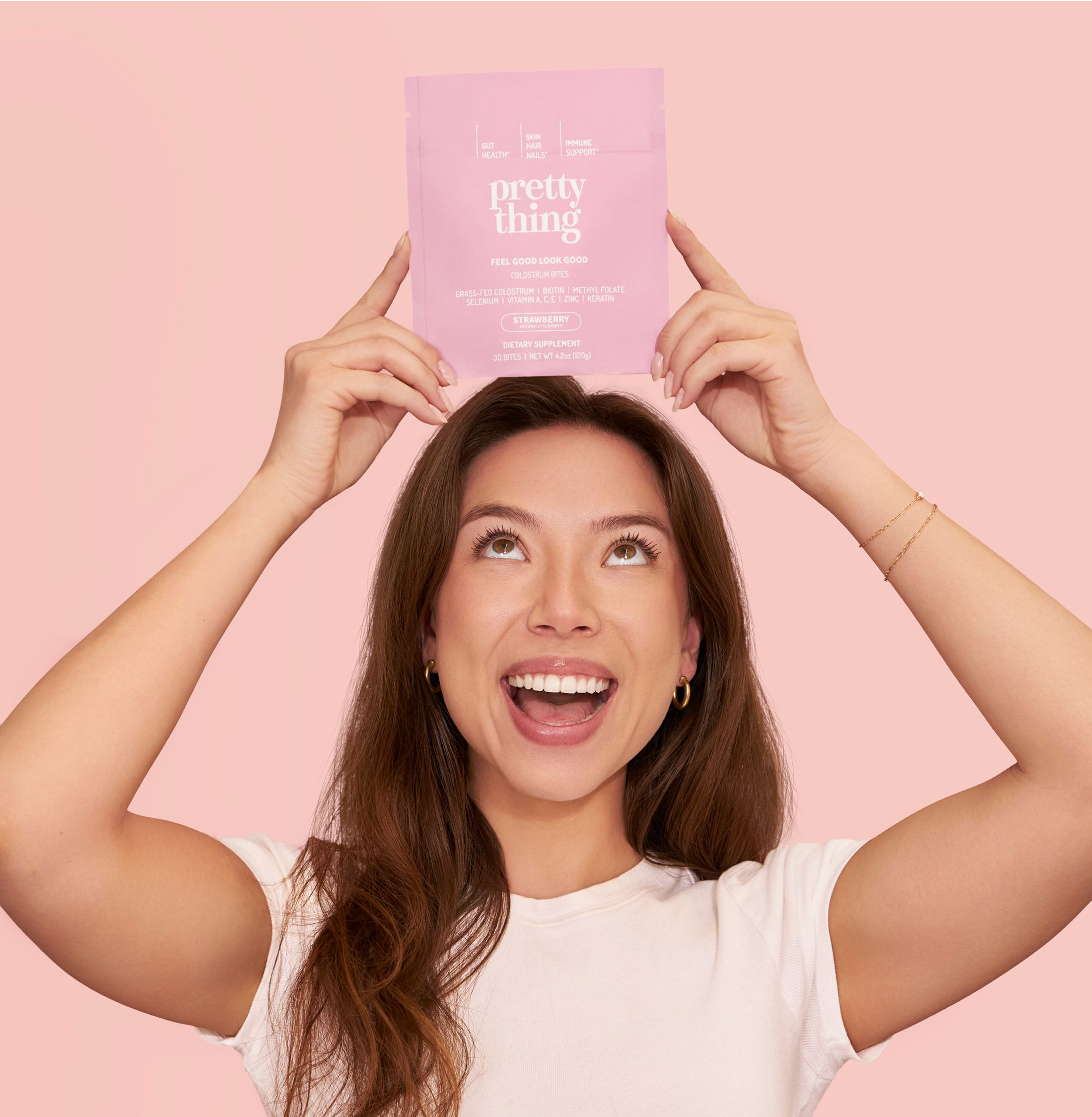 Pretty Thing Bites are colostrum-based supplements designed to support hair growth, glowing skin, stronger nails, better digestion, and overall wellness. Made with