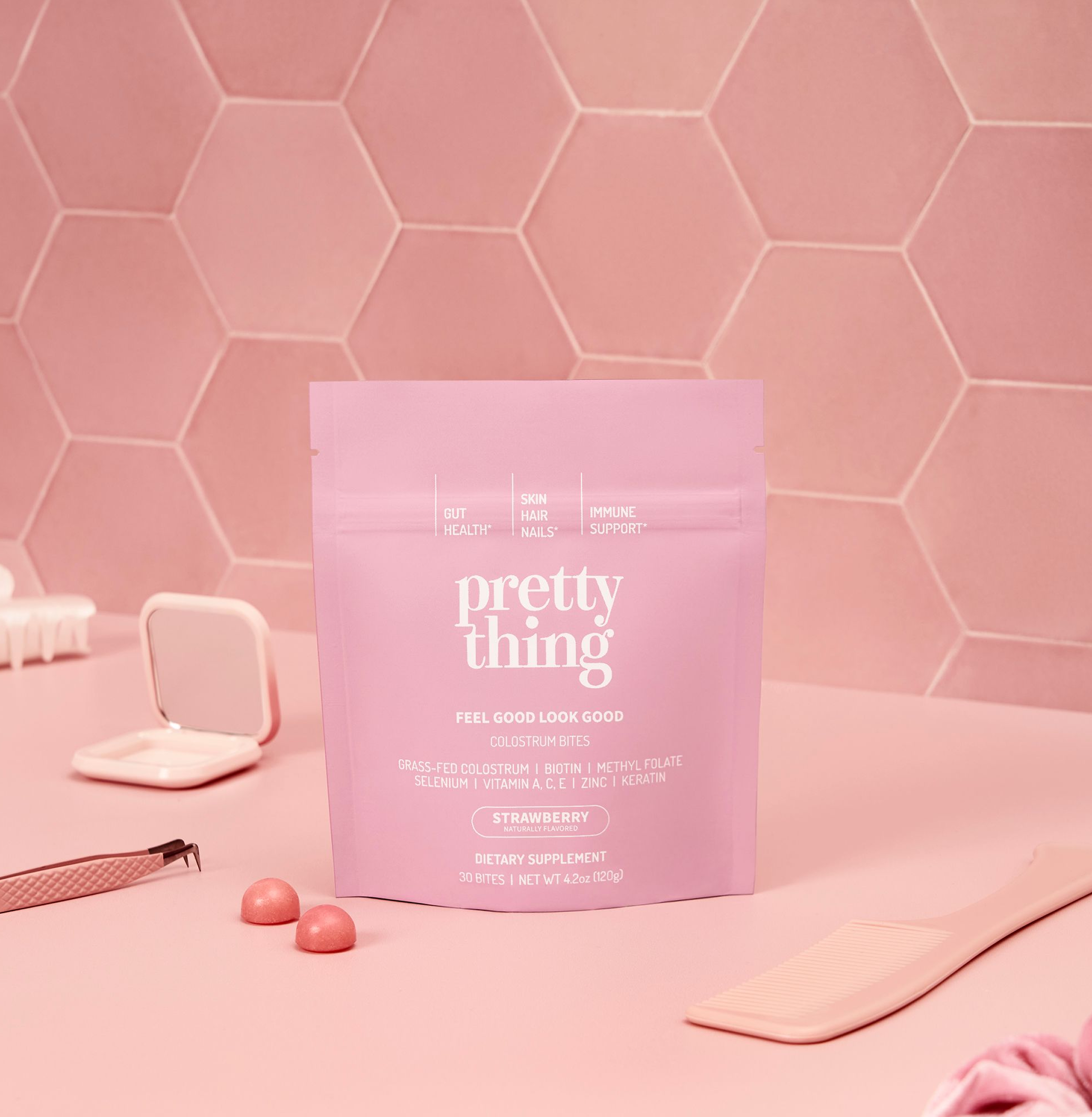 Pretty Thing Bites are colostrum-based supplements designed to support hair growth, glowing skin, stronger nails, better digestion, and overall wellness. Made with grass-fed bovine colostrum, these bites are packed with hundreds of nutrients, prebiotics, antioxidants, and proteins.